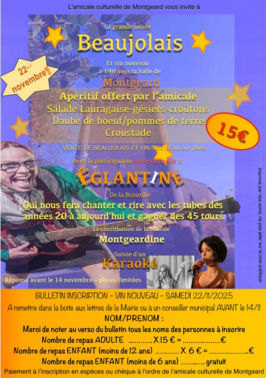 Inscrivez vous vite à la grande soirée Beaujolais qui aura lieu le 22 novembre à 19h sous la halle. Place limitées.