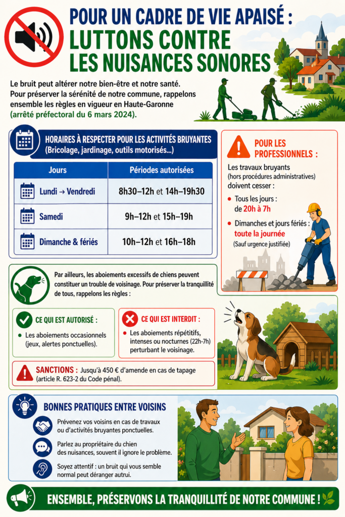 Merci de veiller au respect de la tranquillité de chacun en limitant les bruits de voisinage. Les gestes simples du quotidien contribuent à préserver un cadre de vie agréable pour tous.